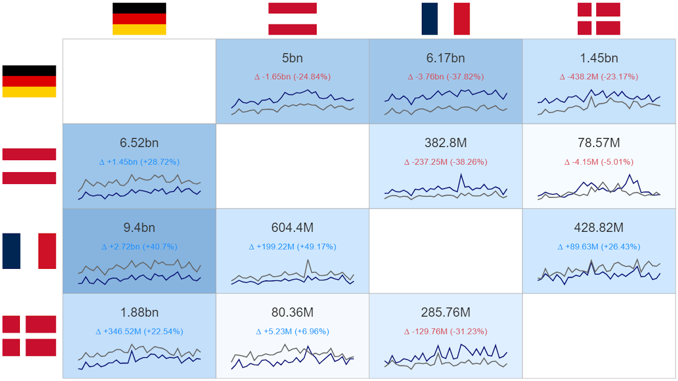Choosing the matrix, users can, just like with the standard matrix visual, visualize relationships of data with two different dimensions at once, or the relationship of two dimensions to each other. KPI Matrix is a matrix made of single KPI cards, descriptive texts or images being the row and column headers.