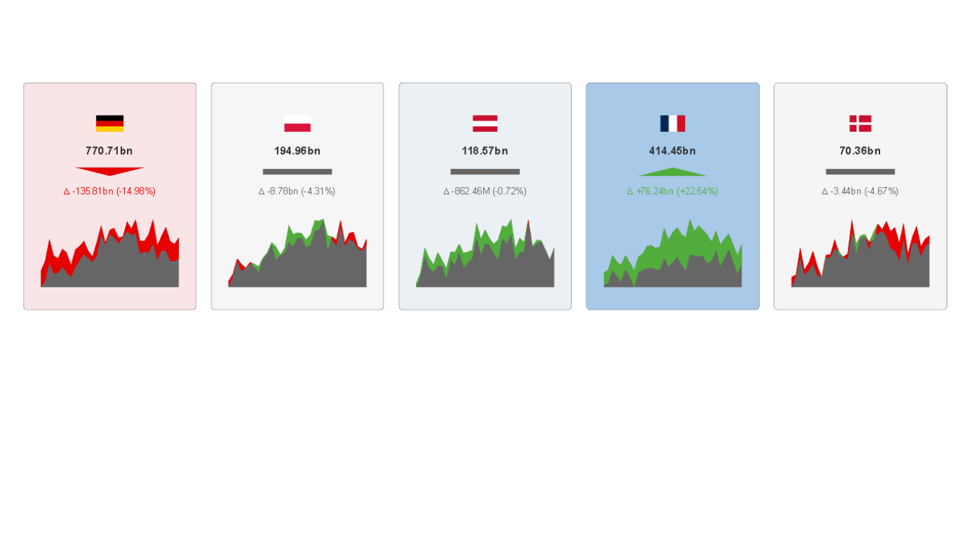 Each card in the matrix shows an actual value and optionally its target value (or any other two kinds of measures compared to each other) as well as an indicator visualizing the difference. There are three indicators to choose from: indicative arrow/triangle, text color or background color.
