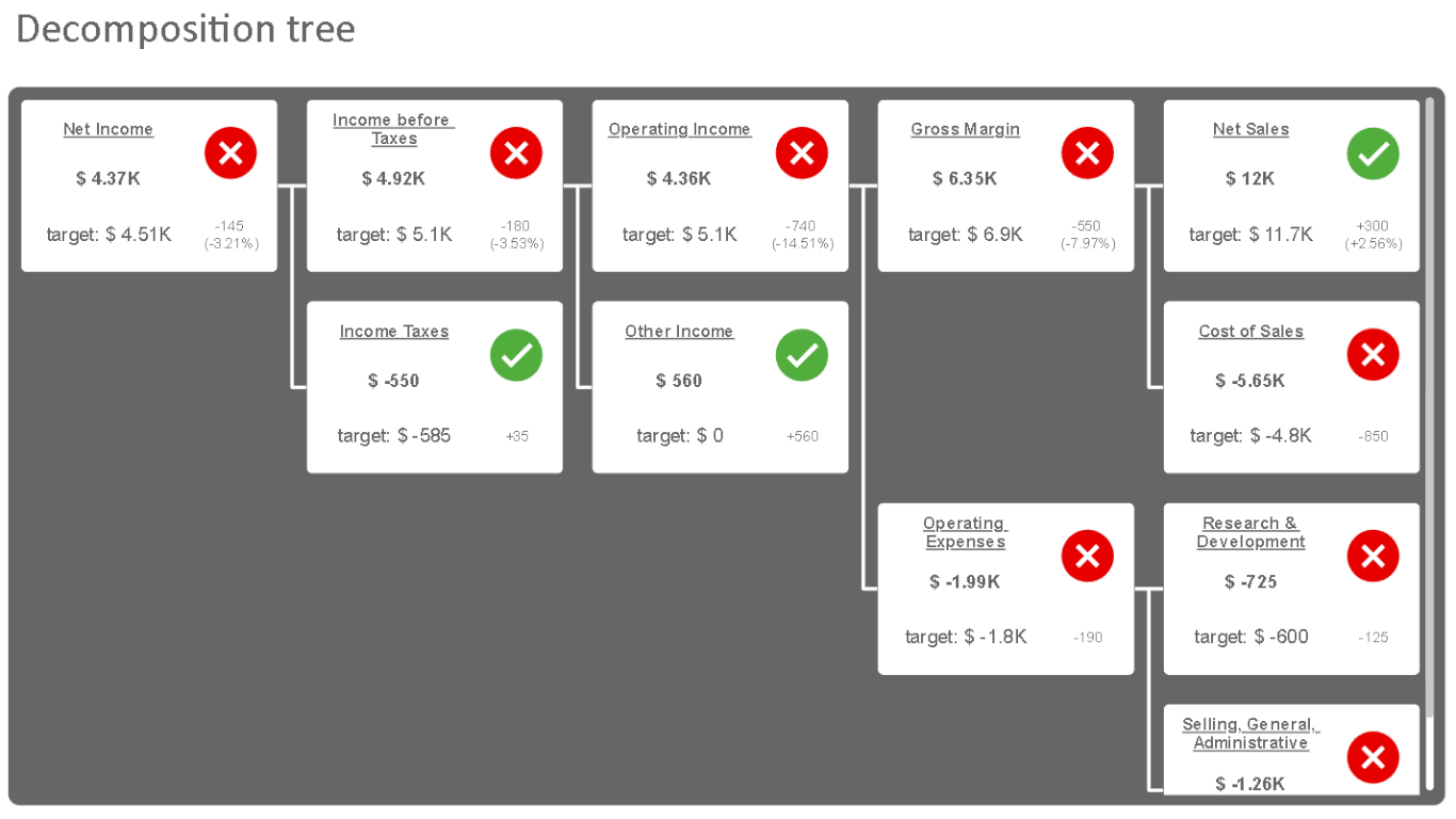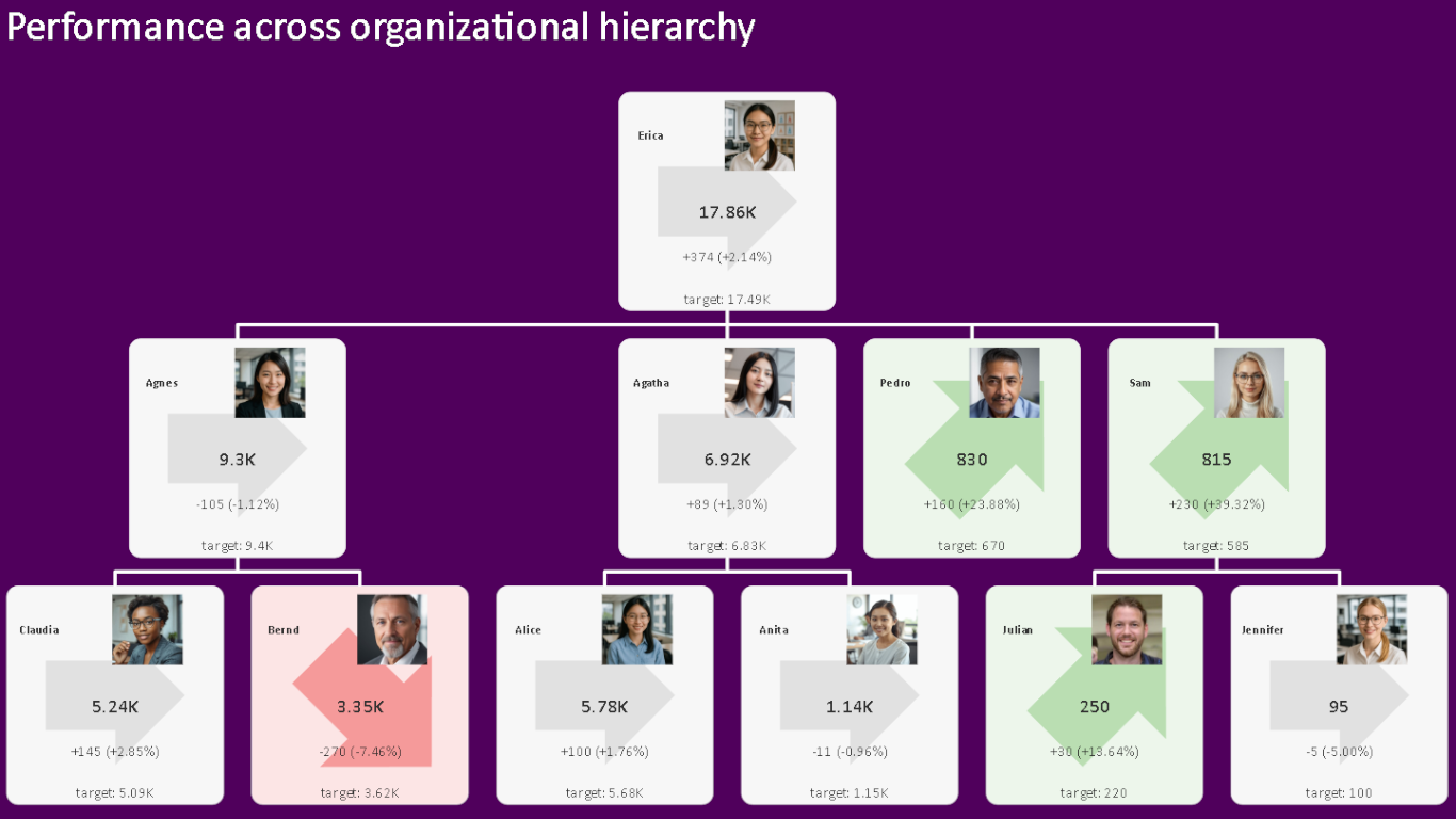 Instead of a flat layout or matrix, KPI Tree organizes your KPIs into a dynamic tree view, making it easy to drill down through hierarchical levels for detail or collapse branches to maintain a clean overview. Each node in the tree represents a KPI card, which can display actual and target values (or any two comparable measures), along with a visual indicator that highlights the variance—ranging from directional symbols to customizable icons.