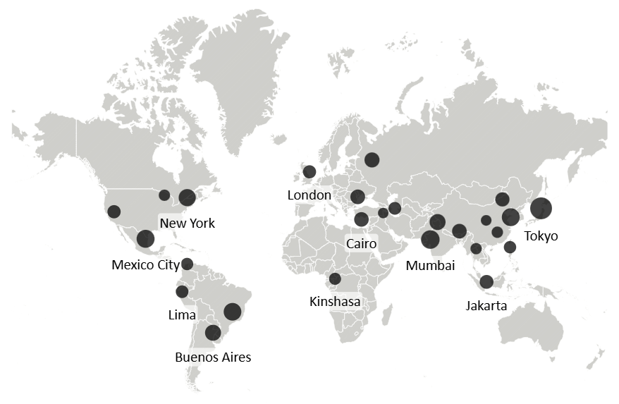 Here is an example where the circle sizes represent the populations of the cities: