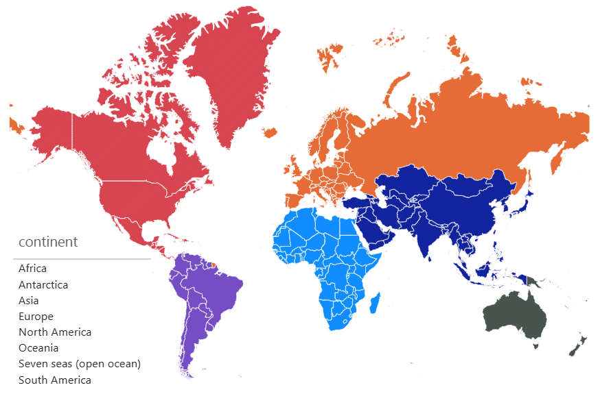 Use a data field containing country names, ISO codes (numerical three-digit or alphabetical two- or three-digit) to reference a single country, continent names, names of regions (United Nations grouping or World Bank grouping), or names of sub-regions to reference a group of countries. By assigning multiple data fields each referencing a different mapping attribute on a different drill level (e.g., continent and country), you can create a hierarchy, users can use to drill down. You can even define your own hierarchies.