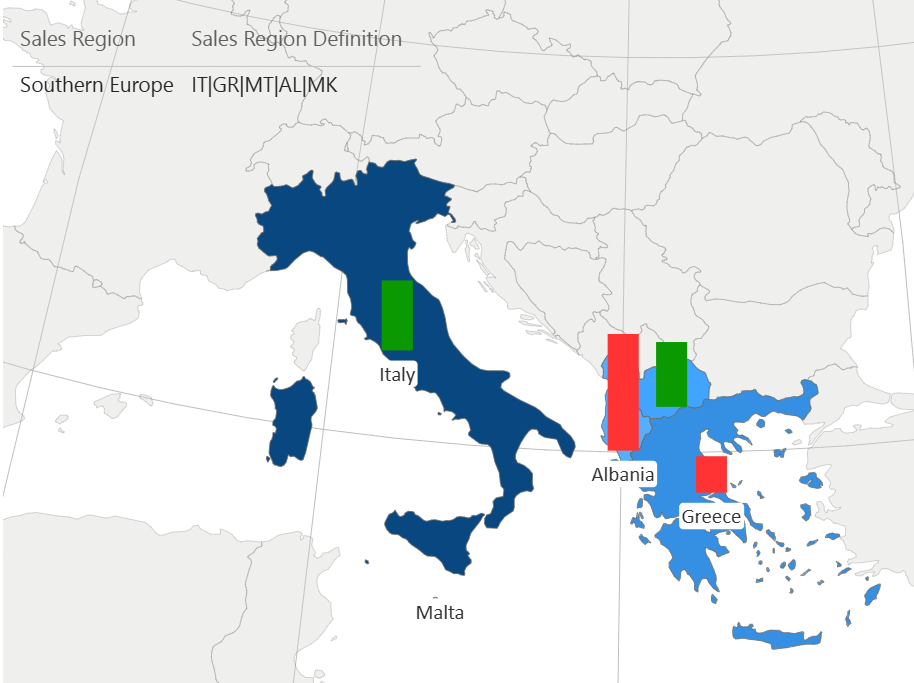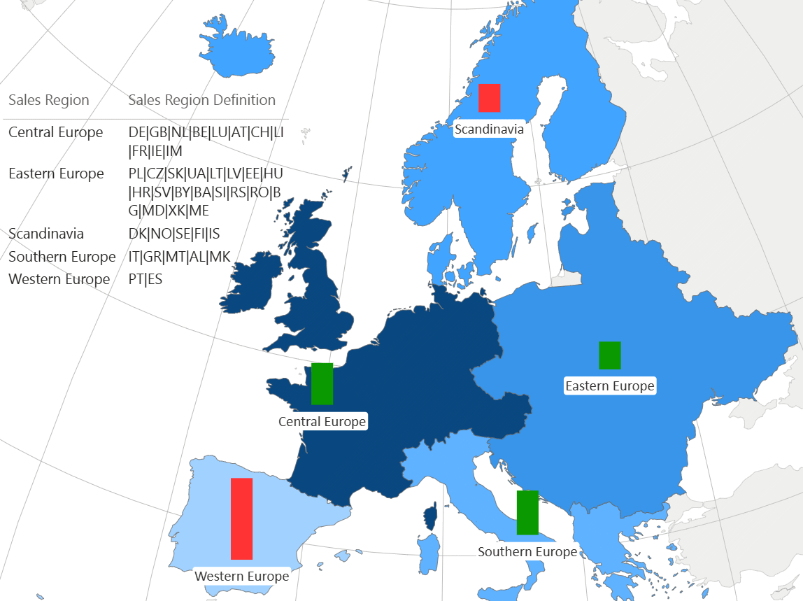 With the "Hierarchy definition" measure, you can define additional groups to create your own two-level drill hierarchy. To create a group, the "Hierarchy definition" measure must contain, for each "Location" value, a list of areas/shapes (with matching mapping attributes) that the group consists of, separated by "|". For example, to define a custom group NAFTA, the measure value for that group would be US|CA|MX.