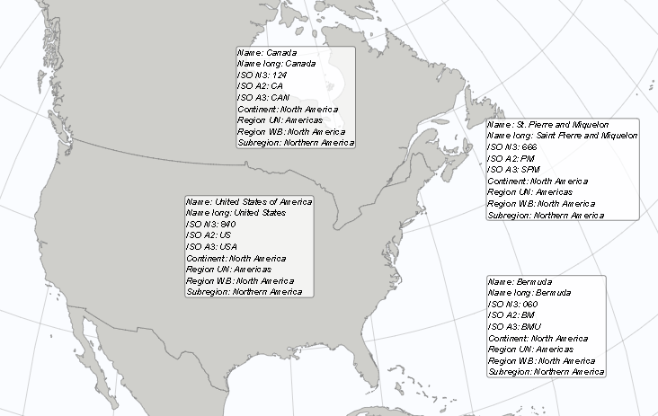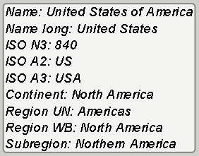 Areas are referenced using so-called mapping attributes. Each area of a map has a set of mapping attributes you can use. For example, on the default world map the United States of America can be referenced using either one of these attributes: